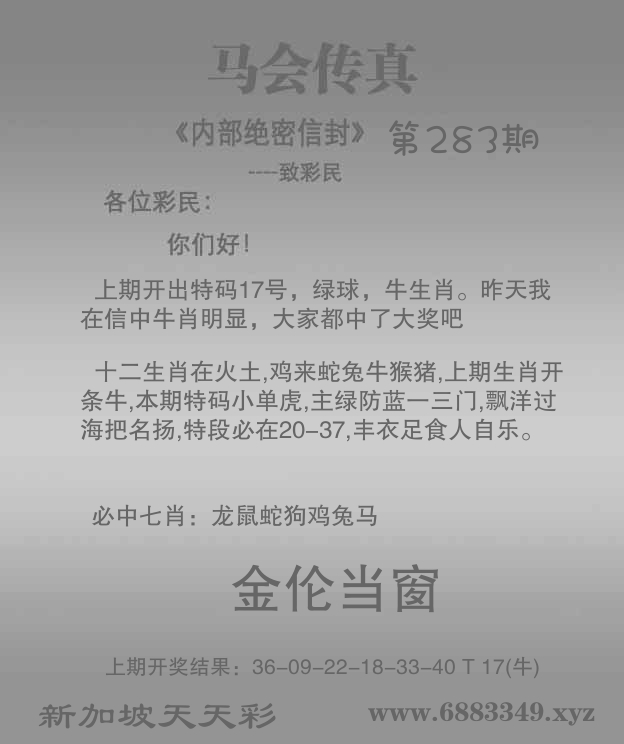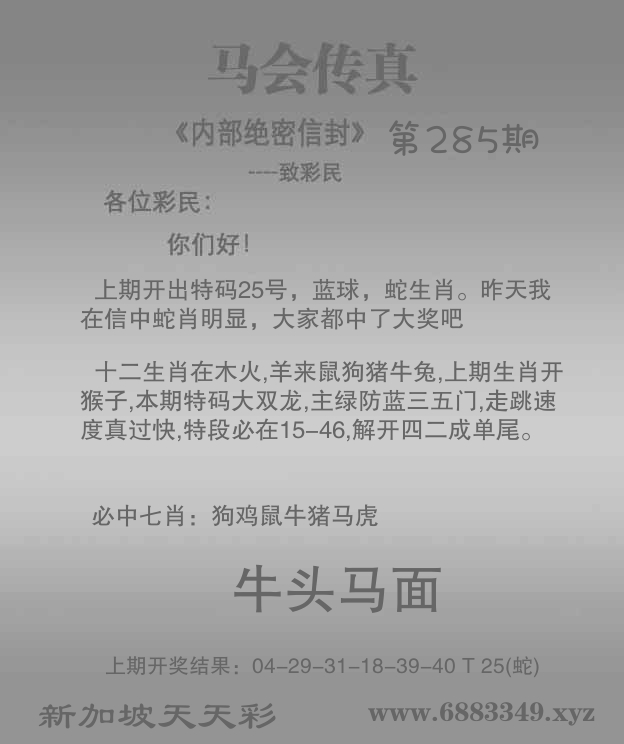 285期: ⑥肖 | 牛兔马蛇猪猴 | 羊35中 |